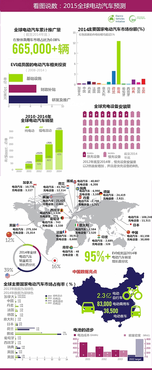 清潔能源部長會議(Clean Energy Ministerial)下屬的電動汽車倡議( Electric Vehicles Initiative,簡稱:EVI)近日發(fā)布《2015年全球電動汽車及充電基礎(chǔ)設(shè)施展望》,本文將重要數(shù)據(jù)提煉成一張圖表,幫助讀者對包含中國在內(nèi)的全球主要國家的電動汽車發(fā)展有一個一目了然的判斷。