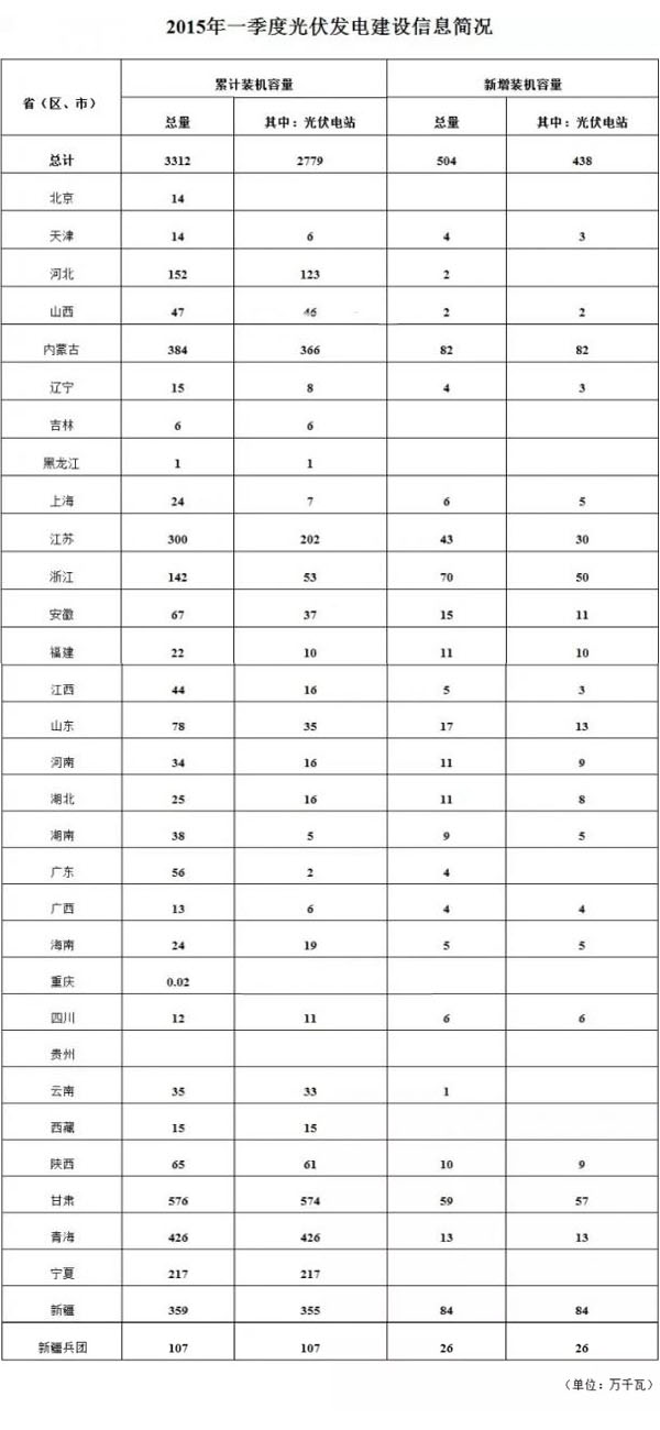 截至2015年3月底,全國光伏發(fā)電累計裝機容量達到3312萬千瓦,其中,光伏電站2779萬千瓦,分布式光伏533萬千瓦。2015年一季度,全國新增光伏發(fā)電累計裝機容量504萬千瓦,其中,新增光伏電站累計裝機容量438萬千瓦,新增分布式光伏累計裝機容量66萬千瓦。一季度光伏發(fā)電量約80億千瓦時。