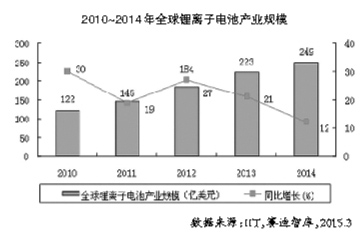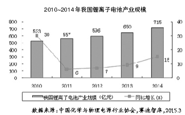 2014年我國鋰離子電池產業規模達到715億元,同比增長15%,增幅比2013年提高6個百分點,增速進一步回暖。受消費電子產品市場增速趨緩以及電動汽車迅猛發展影響,我國鋰離子電池產業發展呈現出“一快一慢”新常態,即動力型鋰離子電池需求快速增長,消費型鋰離子電池市場增速明顯放緩。2014年我國鋰離子電池產業發展呈現以下特征:一是國家高度關注,電動汽車迎來春天;二是政府職能轉變,發展環境不斷優化;三是布局速度加快,鋰離子電池企業忙轉型;四是資本市場活躍,產業整合勢頭凸顯。