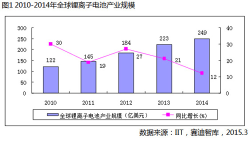 2014年,全球鋰離子電池產業規模穩步擴大至249億美元,同比增長12%,增幅比2013年下滑9個百分點。按容量計算,全球鋰離子電池市場規模達到53.6GWh,同比增長21%。全球鋰離子電池產業發展呈現四大特點:一是動力電池驅動效應顯現;二是產業發展重心進一步向中國轉移;三是技術創新步伐逐步加快;四是產業整合力度持續加強。各國發展態勢不一,日本增速開始回暖,韓國增速明顯下滑,中國保持穩健增長勢頭。