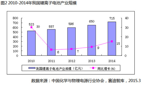 2014年我國鋰離子電池產業規模達到715億元,同比增長15%,增幅比2013年提高6個百分點,增速進一步回暖。受消費電子產品增速趨緩以及電動汽車迅猛發展影響,我國鋰離子電池產業發展呈現出“一快一慢”新常態,即動力型鋰離子電池需求快速增長,消費型鋰離子電池市場增速明顯放緩。2014年我國鋰離子電池產業發展呈現以下特征:一是國家高度關注,電動汽車迎來春天;二是政府職能轉變,發展環境不斷優化;三是布局速度加快,鋰離子電池企業忙轉型;四是資本市場活躍,產業整合勢頭凸顯。