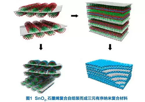 鋰離子電池方面。鋰離子電池通過鋰離子在正負(fù)兩極之間的移動來進(jìn)行工作,因此電池正極材料的導(dǎo)電性能則會密切關(guān)系到鋰離子電池的能量密度和功率性能。實際上,大部分電極材料的比容量都與理論上可達(dá)到的比容量相距甚遠(yuǎn),尤其是在大電流充放電時,電極材料的比容量會大幅下降。石墨烯材料因具備優(yōu)異的電子導(dǎo)電性,被應(yīng)用到鋰電子電池的研究中。石墨烯層應(yīng)用于電池的正極材料中,不僅可以減少電池的界面電阻,便于鋰離子在電池的正負(fù)兩極間傳導(dǎo),還有助于減慢金屬氧化物溶解相變的速度,從而保證鋰電池的電極在電循環(huán)周期中保持結(jié)構(gòu)。有科學(xué)家采用三元共組裝法,將氧化錫與石墨烯整合在一起,與表面活性劑多元協(xié)同,制備出三元有序納米復(fù)合材料(見圖1),該材料用于電極的比容量可達(dá)到760 mA•h/g,且該材料是一種良好的緩沖材料,利于提高鋰離子電池電極材料的循環(huán)穩(wěn)定性。