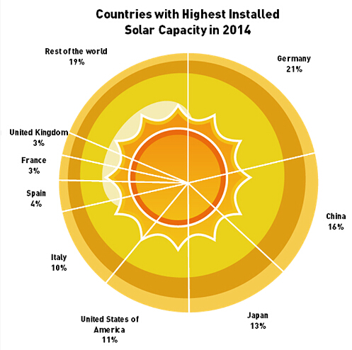 自2000年起,德國的可再生能源法刺激了太陽能產業迎來黃金發展期。其中最重要的一點,就是保障所有太陽能項目的電價能夠以顯著高于市場價格的水平出售給電網運營商。但是,隨著中歐太陽能貿易摩擦愈演愈烈,就目前來看,德國仍然是世界上領先的太陽能市場。但是,較之10年前,德國的太陽能產業已經蒙上了一層陰影。統計顯示,2014年,歐洲太陽能電池制造商的產能占全球的8%。但是,中國的產能占全球的64%。