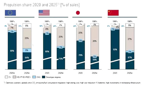 對于不同的全球市場和地域來說,比例略有不同。歐洲市場2020年純電動和插電式混合動力在所有銷售的汽車總量里將占9%,2025年將占31%;中國市場 2020年純電動和插電式混合動力在所有銷售的汽車總量里將占7%,2025年將占32%;美國和日本的數據分別是11%,24%和22%,42%。