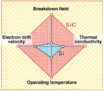 碳化硅物理特性與硅有很大不同。單晶碳化硅比單晶硅具有很多優越的物理特性,例如大約10倍的電場強度、大約高3倍的熱導率、大約寬3倍禁帶寬度、大約高一倍的飽和漂移速度。除此之外,在具體的應用上,雖然碳化硅器件的工藝難度比單晶硅大很多,但是一旦解決工藝問題,碳化硅器件制造流程短,體積重量小、抗氧化壽命長、輸出功率高的特點,將使其成為遠優于單晶硅的21世紀理想半導體材料。而且碳化硅材料對電力的能耗極低,按照如果年產40萬片碳化硅晶片襯底的計劃,僅僅應用在照明領域,每年減耗的電能就相當于節約2600萬噸標準煤,是一種理想的節能材料。