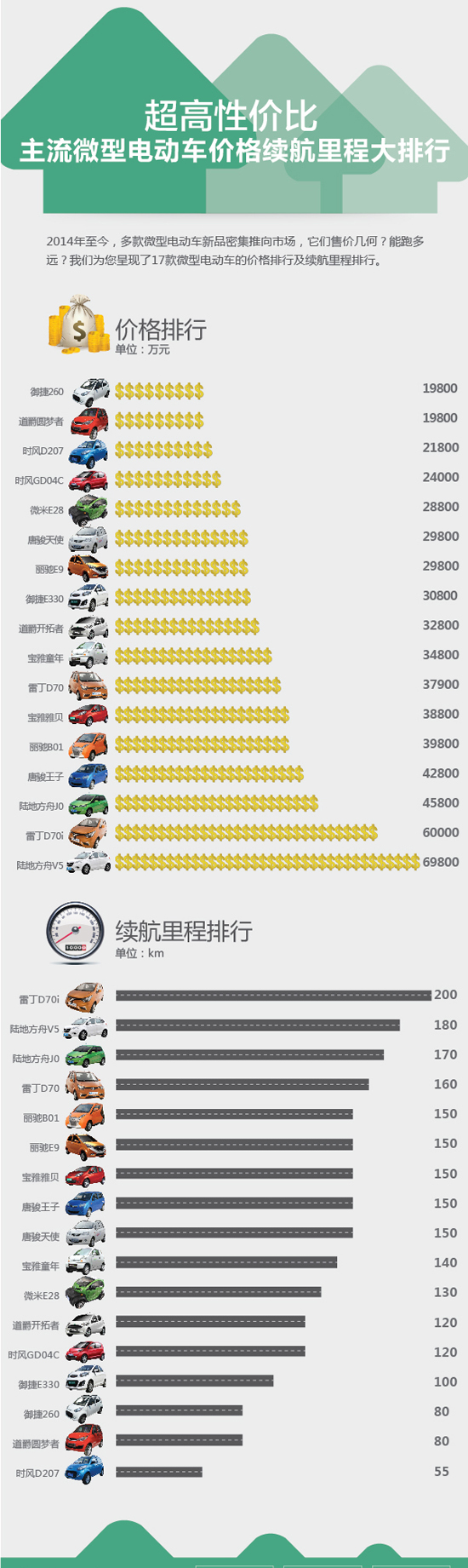 [摘要]2014年至今,多款微型電動車新品密集推向市場,它們售價幾何?能跑多遠?我們為您呈現了17款微型電動車的價格排行及續航里程排行。