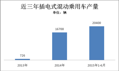 2015年1-6月,插電式混合動(dòng)力乘用車生產(chǎn)2.04萬(wàn)輛,同比增長(zhǎng)4倍。插電式乘用車在所有新能源車型中增長(zhǎng)速度最快。