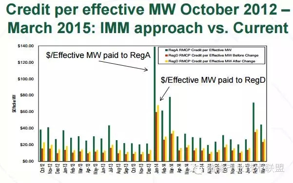 PJM市場的監(jiān)督機構(gòu)曾對PJM市場狀況進行了過長達數(shù)季度的持續(xù)跟蹤。在其發(fā)布的名為MonitoringAnalytics的報告中指出,就單位有效兆瓦的快速調(diào)頻服務(wù)價格而言,PJM市場快速調(diào)頻服務(wù)的價格遠低于常規(guī)調(diào)頻服務(wù)(約56%,如圖1所示)。與此同時,PJM市場的快速調(diào)頻容量只有402.2MW,因此快速調(diào)頻資源存在著過度采購的問題。