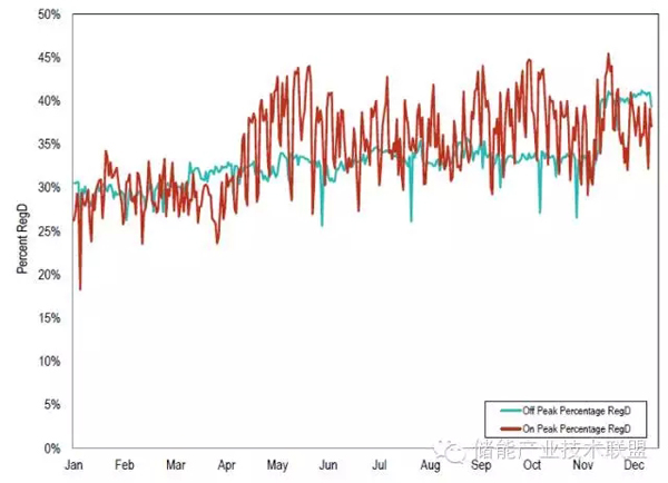 根據(jù)PJM電力市場的監(jiān)管要求,若要保證電力系統(tǒng)的正常運行,PJM市場應(yīng)當具備700MW的高峰調(diào)頻資源和525MW的低谷調(diào)頻資源,同時快速調(diào)頻的可用容量應(yīng)當達到237.3MW,其中高峰和低谷快速調(diào)頻資源分別為150-250MW和100MW。就2015年而言,在某些月份中快速調(diào)頻資源已經(jīng)占到總調(diào)頻資源的42%,有時甚至高達70%,快速調(diào)頻服務(wù)的價格在$20-50/MW之間(相當于常規(guī)調(diào)頻服務(wù)價格的一半)。