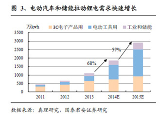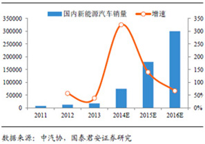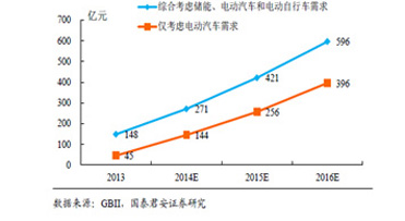 新能源汽車的爆發(fā)性增長和儲能的需求,將為電動汽車的核心部件—動力鋰電池帶來巨大的市場空間。國泰君安證券預(yù)測,如再加上電動自行車和儲能的需求,2015-2016年中國動力鋰電市場規(guī)模將達(dá)人民幣421億和人民幣596億。