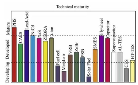 PHS- 抽水蓄能;CAES- 壓縮空氣;Lead-Acid: 鉛酸電池;NiCd: 鎳鎘電池;NaS: 鈉硫電池;ZEBRA: 鎳氯電池;Li-ion: 鋰電池;Fuel cell: 燃料電池;Metal-air: 金屬空氣電池;VRB: 液流電池;ZnbBr: 液流電池;PSB: 液流電池;Solar Fuel: 太陽(yáng)能燃料電池;SMES: 超導(dǎo)儲(chǔ)能;Flywheel: 飛輪; Capacitor/Supercapcitor: 電容/超級(jí)電容;AL-TES: 水/冰儲(chǔ)熱/冷系統(tǒng);CES:低溫儲(chǔ)能系統(tǒng);HT-TES:儲(chǔ)熱系統(tǒng)。