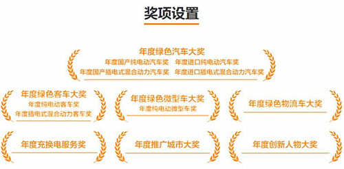 本次評(píng)選活動(dòng)共設(shè)置七大類別14個(gè)細(xì)分獎(jiǎng)項(xiàng),分別是:年度綠色汽車大獎(jiǎng)、年度國產(chǎn)純電動(dòng)汽車獎(jiǎng)、年度國產(chǎn)插電式混合動(dòng)力汽車獎(jiǎng)、年度進(jìn)口純電動(dòng)汽車獎(jiǎng)、年度進(jìn)口插電式混合動(dòng)力汽車獎(jiǎng)、年度綠色客車大獎(jiǎng)、年度純電動(dòng)客車獎(jiǎng)、年度插電式混合動(dòng)力客車獎(jiǎng)、年度綠色微型車大獎(jiǎng)、年度純電動(dòng)微型車獎(jiǎng)、年度電動(dòng)物流車獎(jiǎng)、年度創(chuàng)新人物獎(jiǎng)、年度充電服務(wù)創(chuàng)新獎(jiǎng)、年度推廣城市大獎(jiǎng)。