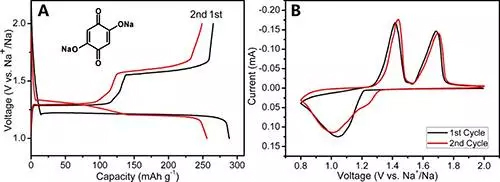 有機負極材料2,5苯醌-1,4二鈉(Na2C6H2O4)的化學結構式和電化學性能