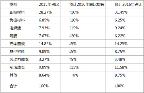 其他部分主要指資金使用成本和環(huán)保成本。目前電池企業(yè)大都在擴(kuò)產(chǎn),而企業(yè)的盈利能力根本不足以支撐這種擴(kuò)張,因此,資金的使用成本很難下降,同時(shí),在環(huán)境壓力越來越大的現(xiàn)實(shí)狀況下,環(huán)保成本毋庸置疑也不可能下降。這些成本2016年不上升就不錯(cuò)。筆者這里預(yù)計(jì)保持2015年的水平。