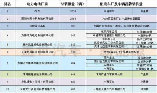表2是為11月份生產(chǎn)的純電動客車提供磷酸鐵鋰動力電池的前10位主要供應(yīng)商信息。從中可以看出,CATL(寧德時代新能源)位居第一,裝機(jī)量為3530輛,主要配套中通客車;第二位是沃特瑪電池公司,裝機(jī)量2983輛,主要為國內(nèi)10家客車廠配套;第三位是合肥國軒高科,裝機(jī)量為900輛,為國內(nèi)12家客車廠配套;第四位是力神動力電池系統(tǒng)有限公司,裝機(jī)量為647輛,主要配套車廠是東風(fēng)汽車、中通客車、東風(fēng)揚(yáng)子江;第五位是惠州比亞迪,裝機(jī)量為542輛;第六位是天津力神電池股份有限公司,裝機(jī)量為539輛,主要為國內(nèi)7家客車廠配套;第七位是力神邁爾斯,裝機(jī)量484輛;第八位是珠海銀隆新能源,裝機(jī)量444輛;第九位是中航鋰電,裝機(jī)量為428輛;第十位是河南太行新能源,裝機(jī)量為402輛。
