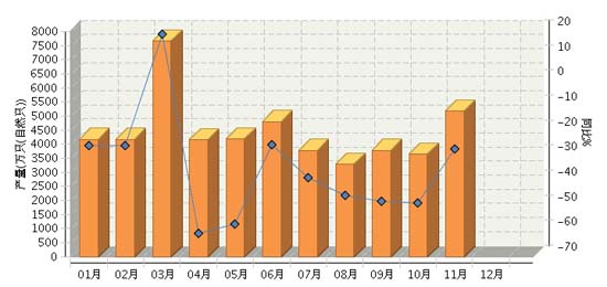 2015年1~11月,全國(guó)堿性蓄電池行業(yè)累計(jì)完成產(chǎn)量同比增長(zhǎng)-29.37%。其中:11月份完成產(chǎn)量同比增長(zhǎng)-26.93%。2015年全國(guó)堿性蓄電池行業(yè)月度產(chǎn)量及同比如上圖所示。