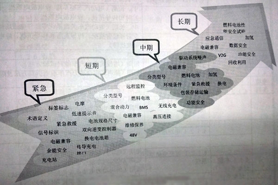 按這四個階段衡量,標準制定工作繁重。在歸類到“緊急”類的標準中,電動汽車低速提示音,電動摩托車標準,電池規格尺寸等標準都還未出臺。在短中長期,標準路線圖則預判了即將隨著技術進步而出現新產品和新技術的標準需求,比如無線充電的標準預計在短期內要出臺;氫燃料電池的有關標準在短、中、長期均有計劃,大致以氫燃料電池車的培育、導入和推廣對應。不過評審現場也有專家表示,處于燃料電池車示范試點的需求,有關的標準出臺時間最好提前。