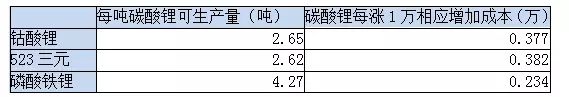 那么按照碳酸鋰漲價幅度11.5萬計算,鈷酸鋰成本增加應為4.3萬,三元為4.4萬,磷鐵為2.7萬。那么分類來看: