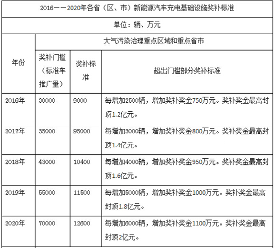 大氣污染治理重點區域和重點省市(包括北京、上海、天津、河北、山西、江蘇、浙江、山東、廣東、海南),2016-2020年新能源汽車(標準車)推廣數量分別不低于3.0萬輛、3.5萬輛、4.3萬輛、5.5萬輛、7萬輛,且推廣的新能源汽車數量占本地區新增及更新的汽車總量比例不低于2%、3%、4%、5%、6%。
