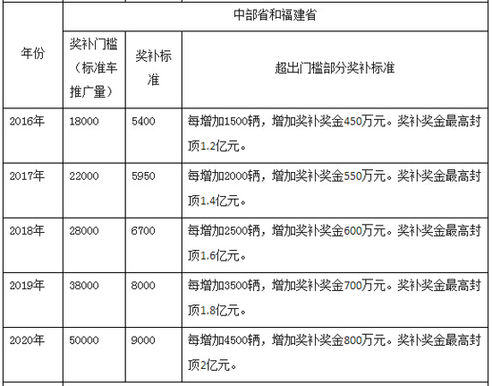 中部省(包括安徽、江西、河南、湖北、湖南)和福建省,2016-2020年新能源汽車(標準車)推廣數量分別不低于1.8萬輛、2.2萬輛、2.8萬輛、3.8萬輛、5.0萬輛,且推廣的新能源汽車數量占本地區新增及更新的汽車總量比例不低于1.5%、2%、3%、4%、5%。