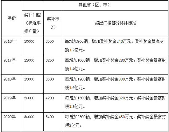 其他省(區、市)2016-2020年新能源汽車(標準車)推廣數量分別不低于1.0萬輛、1.2萬輛、1.5萬輛、2.0萬輛、3.0萬輛,且推廣的新能源汽車數量占本地區新增及更新的汽車總量比例不低于1%、1.5%、2%、2.5%、3%。