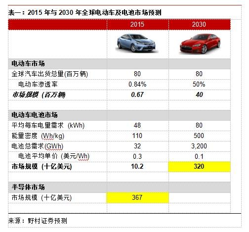 我們假設(shè)全球電動汽車的電池市場普及率能達到50%,估計電動車動力電池市場規(guī)模將在2030年達到3200億-4000億美元,幾乎與目前全球半導(dǎo)體市場營收持平。