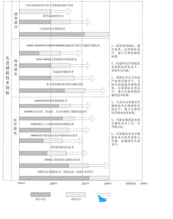 尤為值得注意的是,該《計劃》列舉了包括“先進儲能技術創新”、“氫能與燃料電池技術創新”、“能源互聯網技術創新”等15項重點任務。而《路線圖》則明確了上述15項重點任務的具體戰略方向、創新目標及創新行動。以下為先進儲能技術路線圖、戰略方向、創新目標及創新行動具體內容。