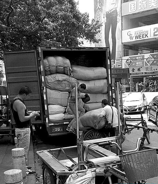 卸完貨還沒喘口氣,張燕明又接到一單,拉一車布匹去大塘的一家制衣廠。當(dāng)他騎著滿載的三輪車準(zhǔn)備加速時,突然發(fā)現(xiàn)逸景路口有交警查車。張燕明立即拐進路邊的銀嶺皮革毛絨市場內(nèi)。